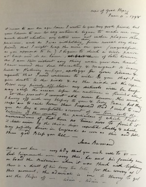 4.4 The 11 June 1798 letter, then, is a replacement for the ‘real’ but incomplete intended letter based on ‘memorandums‘ for Dundas, and is more of a note than a letter of the kind she otherwise wrote to him. The opportunity to dispatch it came with the departure of the Teignmouths and their ship, and it happened more precipitously than anticipated, which was what contracted her original intention and led to the production of this short note-like piece of writing. And it should also be noted that this non-existent but ‘real’ letter was in fact a quasi-letter because actually based on a quasi-diary.